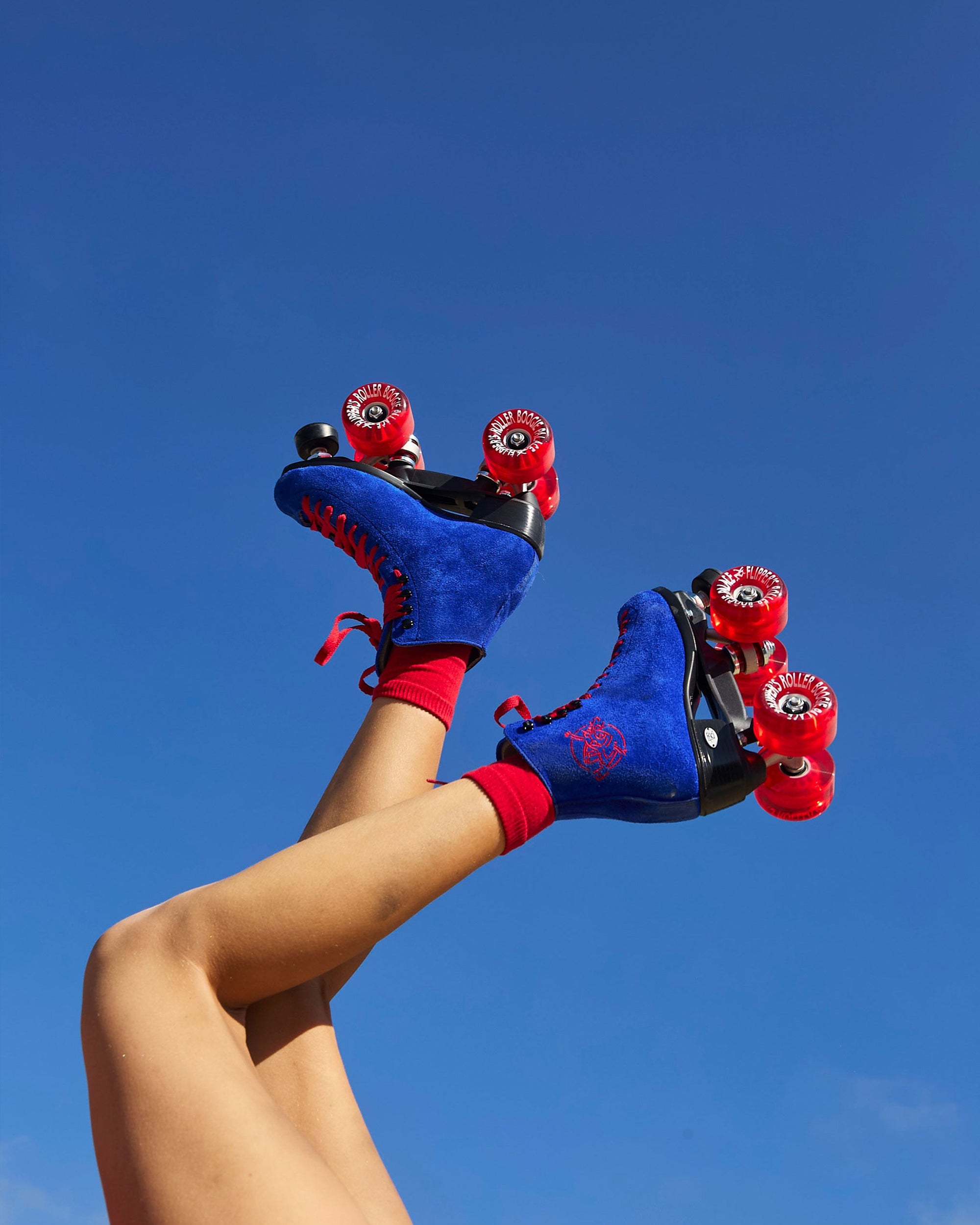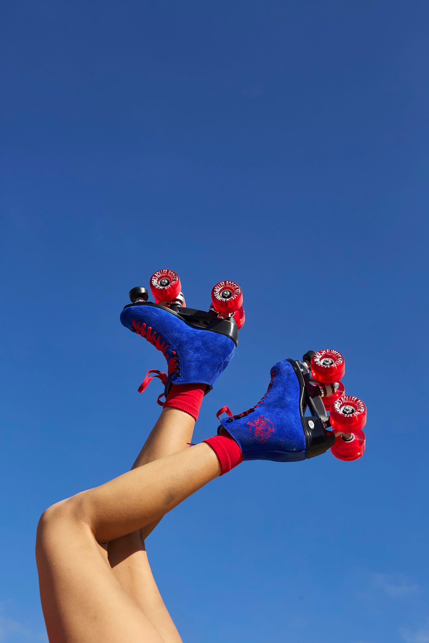 Bold blue suede and vibrant red laces inspired by the iconic roller skate from Flipper's Roller Boogie Palace in 1979.